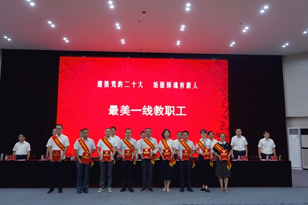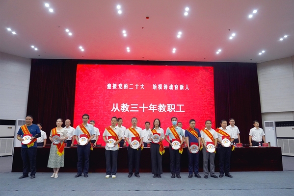 校党委书记陈向军发表讲话。他代表学校党委、行政,向辛苦耕耘在教学科研、服务管理岗位上的全体教职工致以节日的问候,向受到表彰的先进集体和个人表示热烈的祝贺,向从教满30周年的教职工和离退休教职工为学校改革发展所做出的贡献表示衷心的感谢,向新加入黄师大家庭的教师们表示诚挚的欢迎。陈向军指出,今年是党的二十大召开之年,是向第二个百年奋斗目标进军新征程的重要一年,为今年的教师节赋予了特殊意义。教育部将今年教师节的主题确定为“迎接党的二十大,培根铸魂育新人”,这个主题内涵丰富,既体现了广大教师承载的光荣历史使命,又体现了党和人民对教师的时代重托。